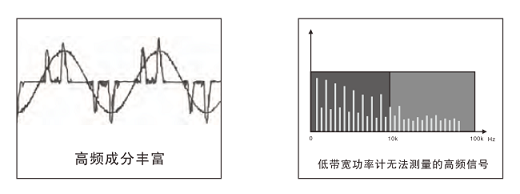 在测量正弦波时,如测试开关电源、变频家电等输入波形中含有丰富高频谐波成分时,功率计的测量频率范围及带宽不够的情况下,无法测试其高频谐波分量, PF2010能够保证在测试这类产品时,准确测量功率及功率因素。