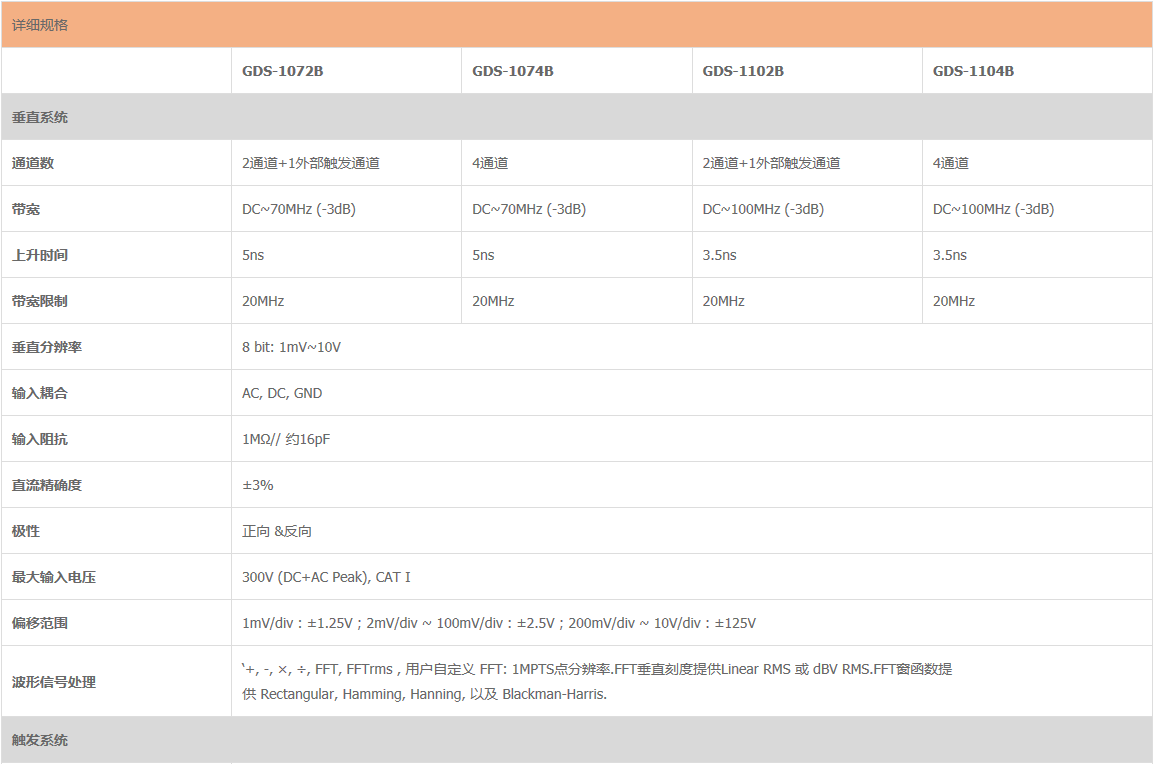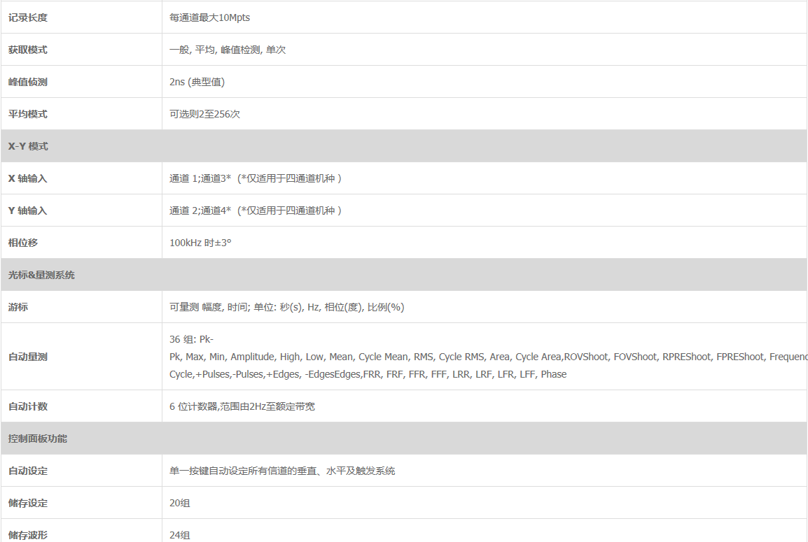 此产品亦可搭配40MHz双通道差分测试探棒,对于一些要求严苛的电源以及接地环境可提供等效之隔离通道效果。使用者亦能将示波器当作是一方便使用的USB储存元件,可随时储存波形影像以及点阵资料。另外还可以与智能型手机连线,将储存的资料传输出去。多样化的应用软件可让使用者体会固纬示波器的贴心设计,其中进阶数字万用表功能以及GO/NOGO模板之编辑,能帮助使用者进行进阶多样化的功能量测。工程计算机、衰减值计算分析,以及电阻值计算分析软件可帮助使用者进行辅助功能之应用,多样化也深具魅力的多功能性呈现了完整的技术整合理念。快速选型: