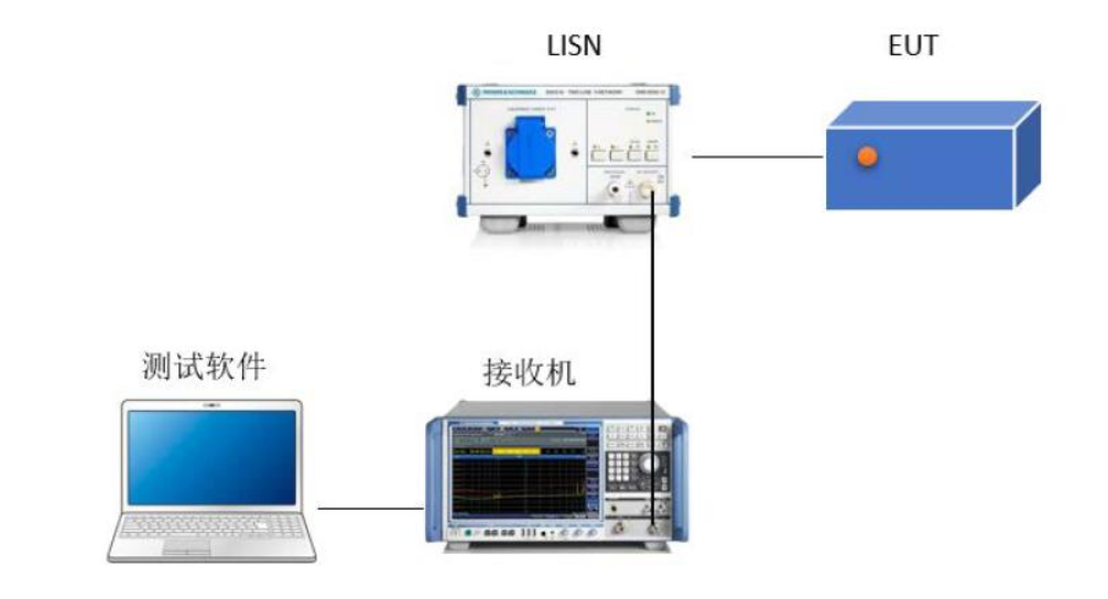 系统主要由EMI测试接收机、人工电源网络(LISN)和EMC测试软件组成。其中人工电源网络可以在给定的频率范围内,为骚扰电压的测量提供标准规定的50Ω阻抗,并使受试设备(EUT)与电源相互隔离。