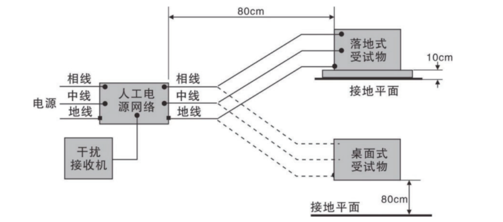 测试时,人工电源网络的输出端子与受试设备端子应相距0.8m,并用一根0.8m长的三芯软缆中的两根动力线连接。台式受试设备的高度要求0.8m以上,落地式设备的高度要求0.1m以上。墙面和地面要放置接地金属板,EUT距离垂直接地金属板0.4m(下图为配置示意图)。
