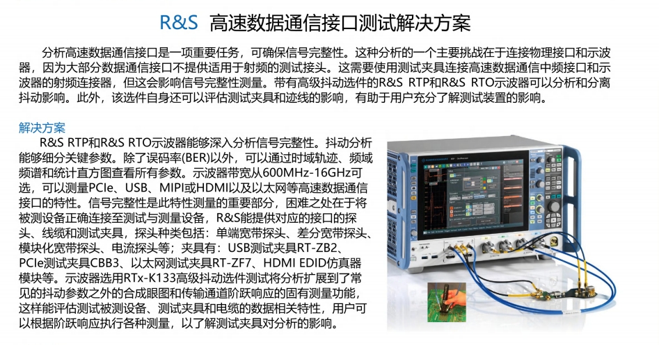 分析高速数据通信接口是一项重要任务,可确保信号完整性。这种分析的一个主要挑战在于连接物理接口和示波器,因为大部分数据通信接口不提供适用于射频的测试接头。这需要使用测试夹具连接高速数据通信中频接口和示波器的射频连接器,但这会影响信号完整性测量。带有高级抖动选件R&S®RTP和R&S®RTO示波器可以分析和分离抖动影响。此外,该选件自身还可以评估测试夹具和迹线的影响,有助于用户充分了解测试装置的影响。